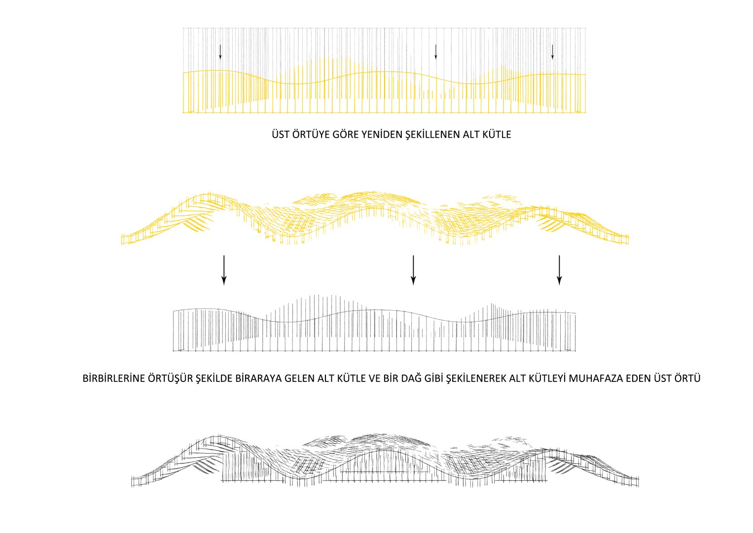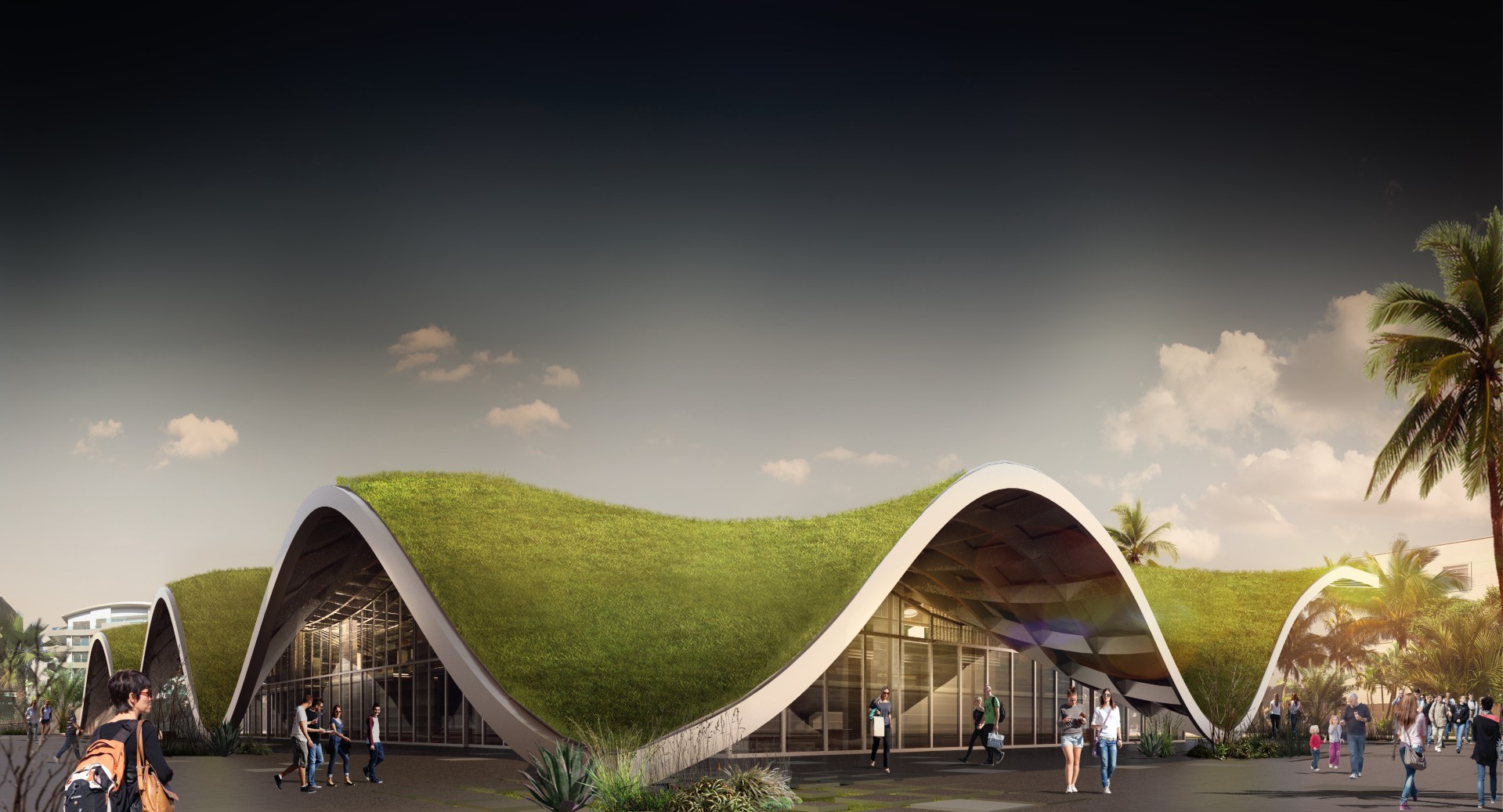 Tasarımda, organik formuyla tıpkı bölgenin sıradağlarla çevrelenmiş doğal yapısını anımsatan yekpare çatı örtüsünü tercih eden mimarlar; çatının, kullanıcılarını farklı birçok doğrultudan içine alarak üzerini örttüğü bu alanda buluşturmasını hedeflemiş. Ayrıca üzerini örttüğü bu korunaklı alanla her mevsim sağlıklı bir kullanıma olanak veren çatı ile doğal ışığın mekân içine alımı artırılmış ve hava sirkülasyonu kuvvetlendirilmiş.